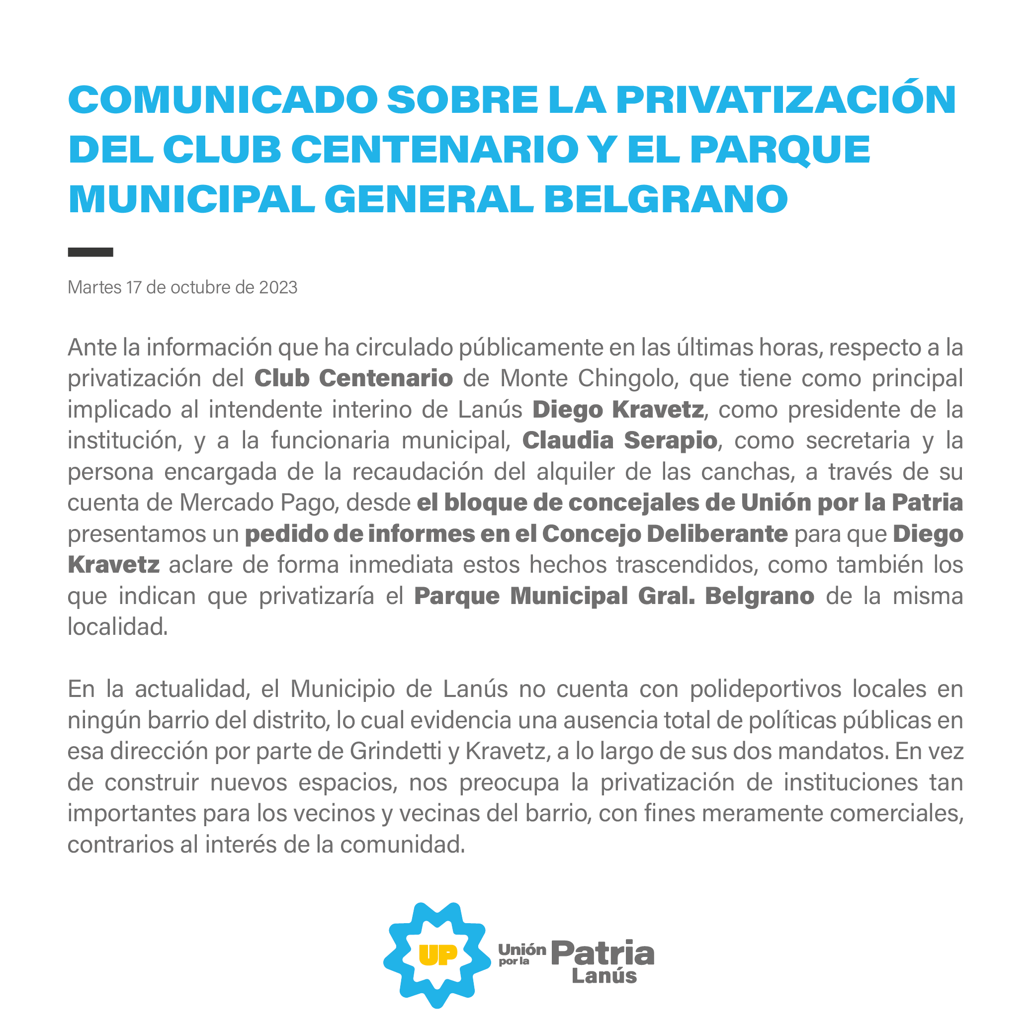Ante la información que ha circulado públicamente en las últimas horas, respecto a la privatización del Club Centenario de Monte Chingolo, que tiene como principal implicado al intendente interino de Lanús Diego Kravetz, como presidente de la institución, y a la funcionaria municipal, Claudia Serapio, como secretaria y la persona encargada de la recaudación del alquiler de las canchas, a través de su cuenta de Mercado Pago, desde el bloque de concejales de Unión por la Patria presentamos un pedido de informes en el Concejo Deliberante para que Diego Kravetz aclare de forma inmediata estos hechos trascendidos, como también los que indican que privatizaría el Parque Municipal Gral. Belgrano de la misma localidad.