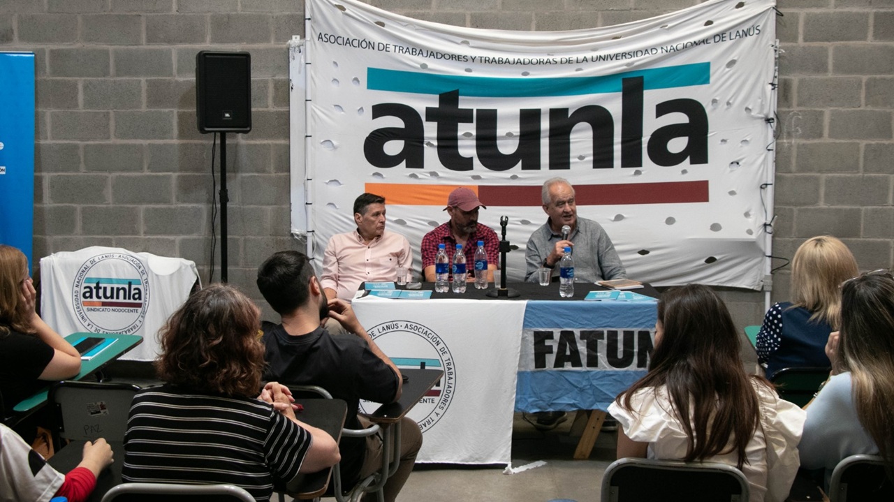 La mesa principal estuvo integrada por Merkis; el secretario gremial de FATUN, Rubén Núñez; y el secretario general de ATUNLa, Julián Di Silvestro. También participaron representantes de gremios nodocentes del Conurbano y referentes de distintas asociaciones de base.