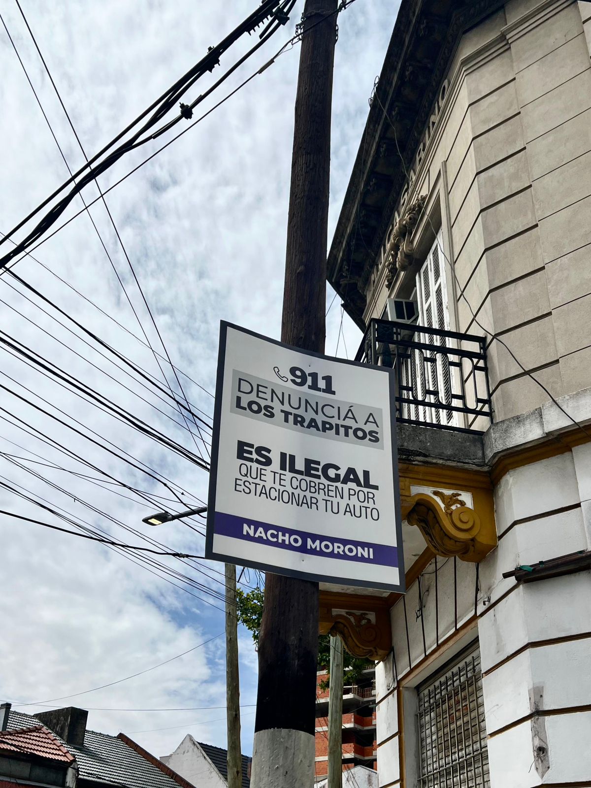 El concejal de La Libertad Avanza en Lanús, Nacho Moroni, colocó carteles en el centro del distrito para advertir que es ilegal cobrar por estacionar en la vía pública y promover la denuncia al 911 cuando hay casos de extorsión y amenazas.