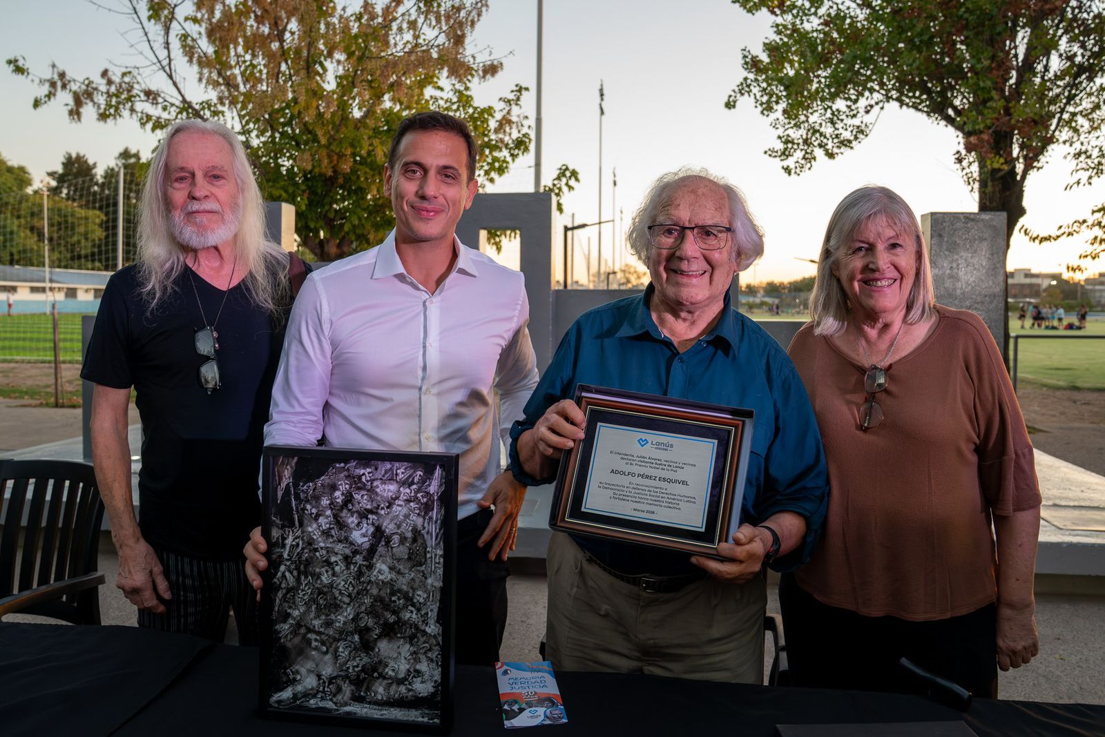 Una vez finalizada su alocución, el jefe Comunal le entregó una placa a Adolfo con la que fue declarado como visitante ilustre del distrito y el artista lanusense, Carlos Pérez Turco, le obsequió un cuadro.