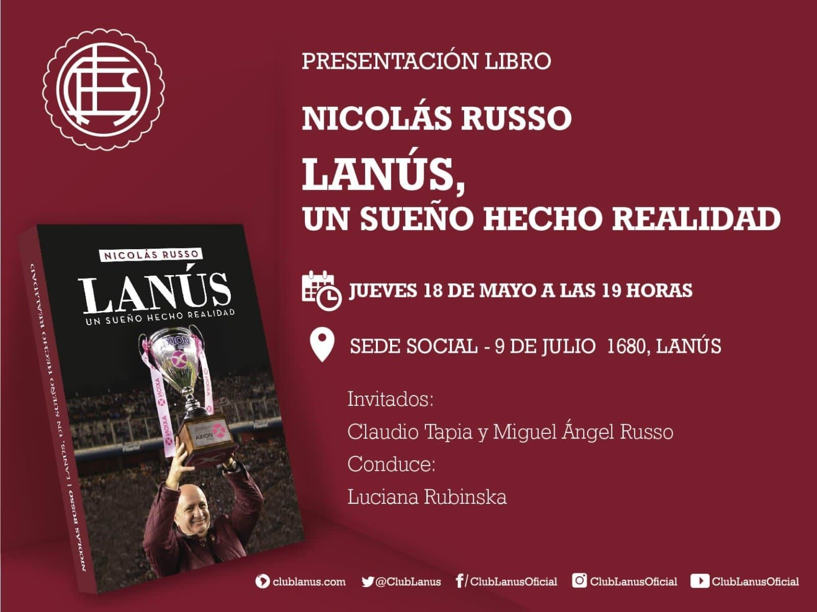 El precandidato a intendente de Lanús y ex presidente del Granate, Nicolás Russo, presentará este jueves 18 de mayo su libro "Lanús, un sueño hecho realidad", en el que repasa sus vivencias a lo largo de sus 33 años como dirigente deportivo. El evento tendrá lugar en el Microestadio Antonio Rotili de la sede social, a partir de las 19.