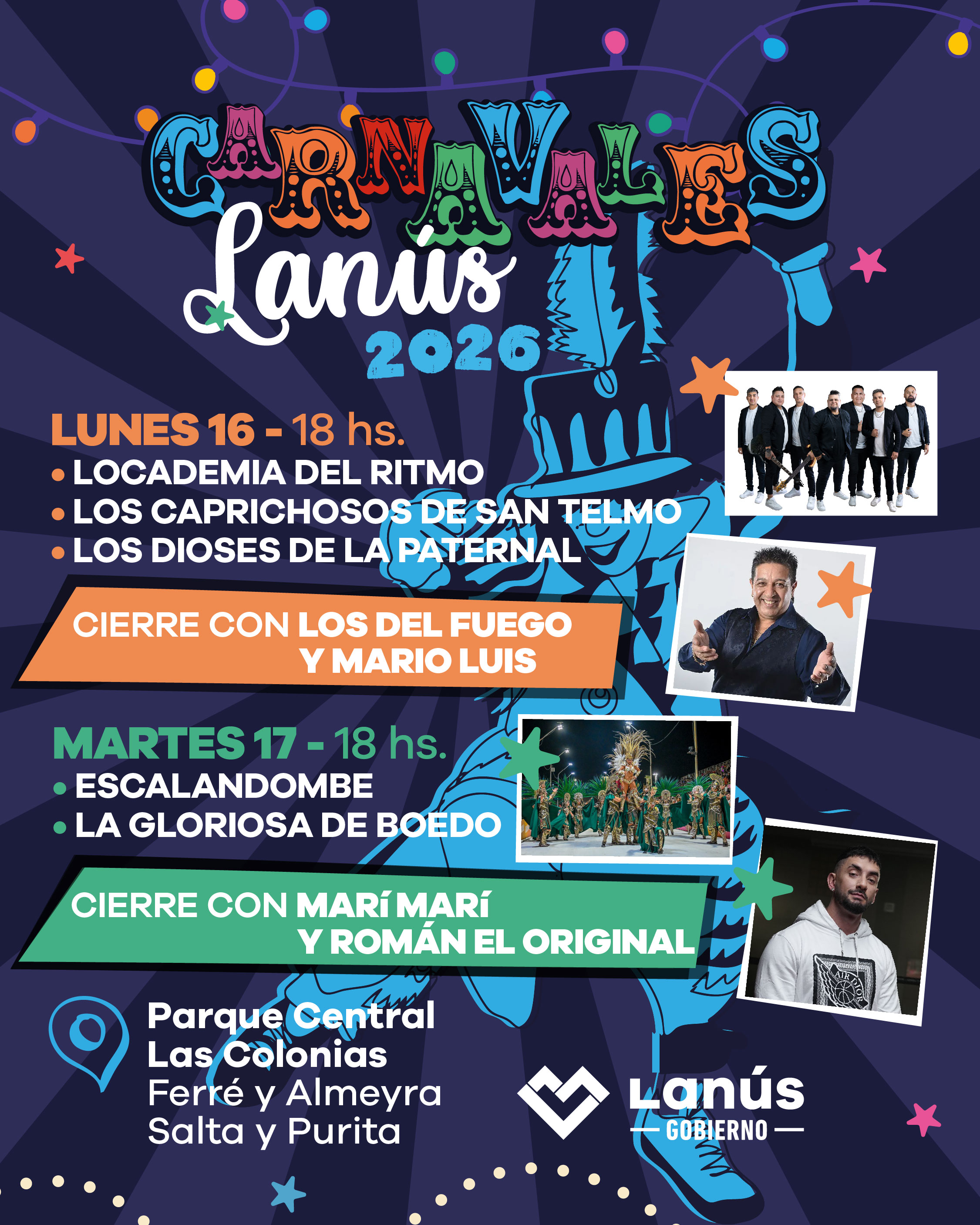 Durante el lunes, desde las 18, brindarán sus shows Locademia Del Ritmo, Los Caprichosos de San Telmo, Los Dioses de la Paternal, Los Del Fuego y el cierre estará a cargo de Mario Luis.