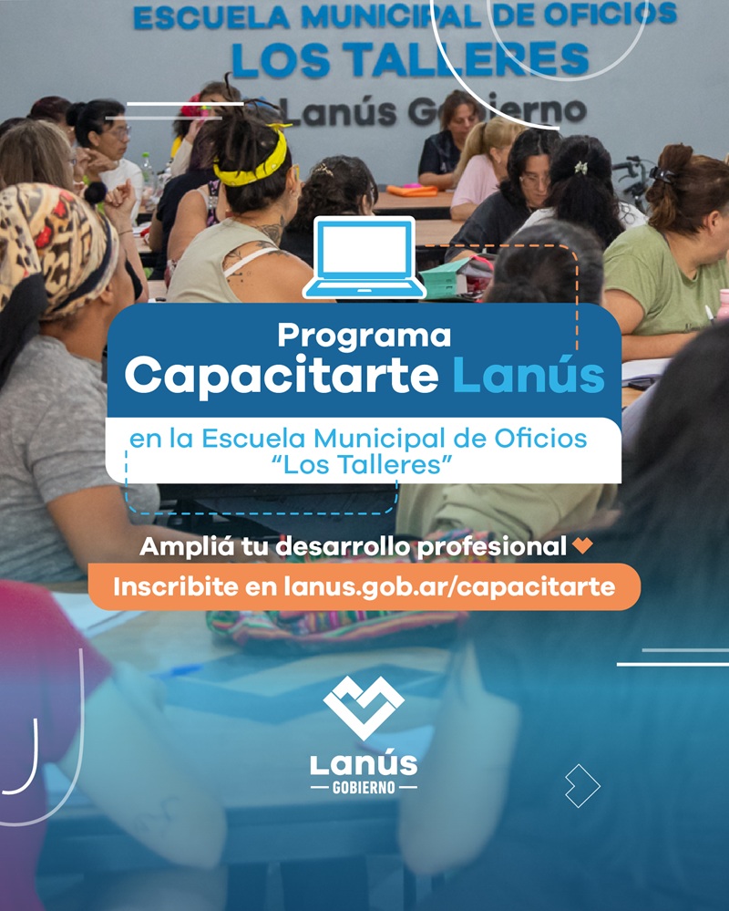 Lanús Gobierno informa que se encuentran abiertas las inscripciones para que los vecinos y las vecinas puedan formar parte de una nueva edición del programa “Capacitarte Lanús” en la Escuela Municipal de Oficios “Los Talleres”, ubicada en Dr. Lorenzo Guarracino N° 3025, en Remedios de Escalada, con el objetivo de que adquieran herramientas para potenciar su desarrollo personal, profesional y laboral.